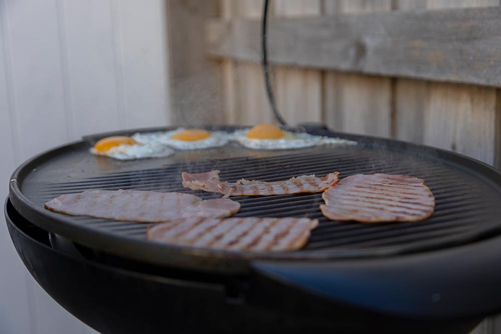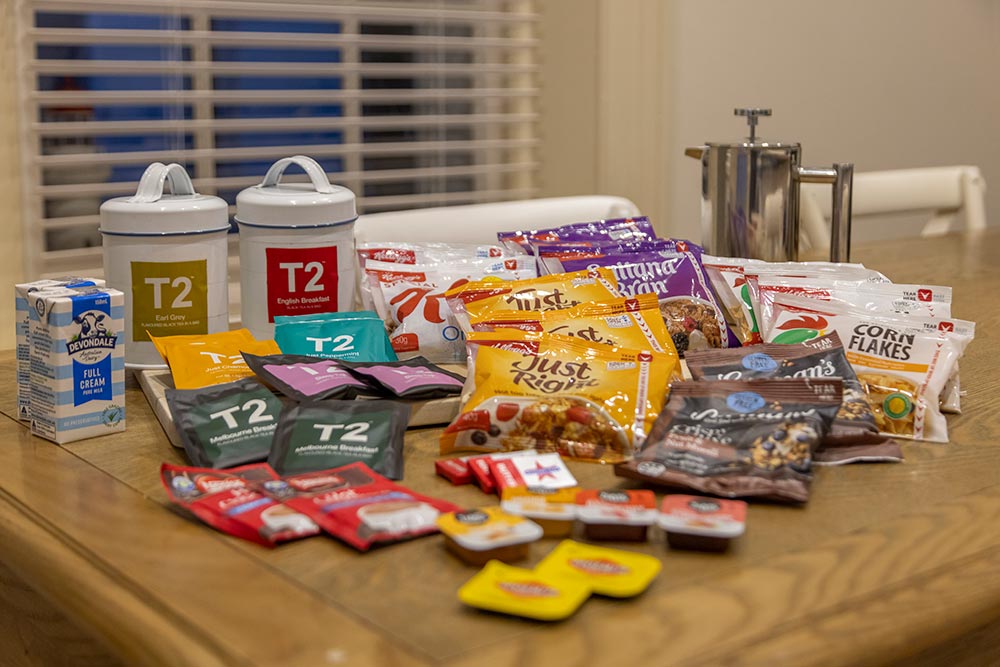 Breakfast supplies are provided, including a selection of cereals and spreads, bread for toast, eggs, and bacon. Milk, tea, and coffee are also supplied.