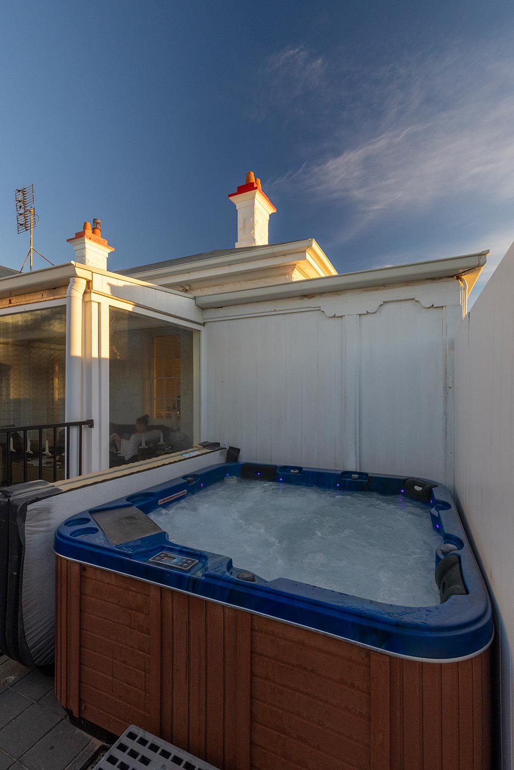 We added a sheltered courtyard, a spa, and a large sunroom to enhance the amenities of this cottage.